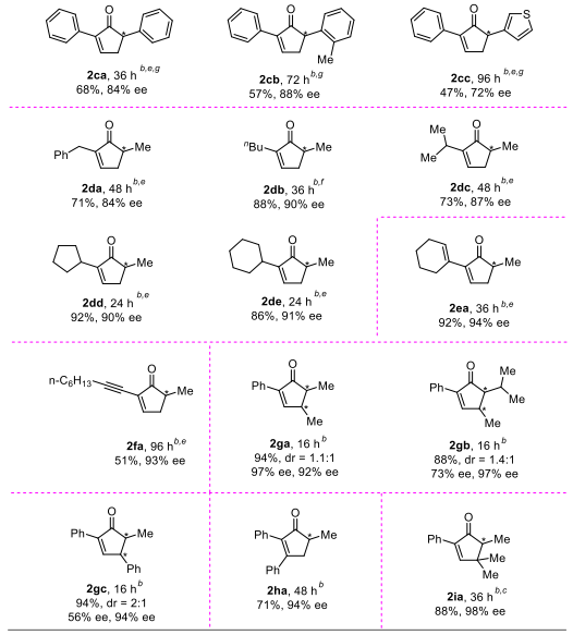 研究者进而考察了该反应底物的普适性(图3)。当底物R1为苯基或者取代苯基时,反应都能以优秀的收率(83-93%)和对映选择性(87-95% ee)获得目标产物(2aa−2ai)。将反应放大至克级规模,收率和对映选择性均能保持。底物带有稠环和杂芳环也能取得优秀的结果(2aj-2al)。固定R1一侧为苯基,R2基团可以为直链烷基(2ba-2bc)、支链烷基(2bd和2be)和官能化的烷基(2bf-2bh)等,所有反应都可以顺利发生,给出令人满意的收率(73-94%)和对映选择性(65-97% ee)。当R1和R2均为芳基(2ca-2cc),甚至两侧基团完全相同时(2ca),反应仍能获得不错的结果。R1和R2也可以都是烷基取代基(2da-2de),反应能以高达92%的收率和91%的对映选择性获得相应产物。R1也可以为烯基和炔基(2ea和2fa);甚至对于多取代二烯酮底物(2ga-2gc,2ha,2ia),反应也能获得优秀的收率和对映选择性。但当R4为单取代时(2ga-2gc),反应的dr值不高,说明在现有条件下底物β位的立体化学不能很好的控制。