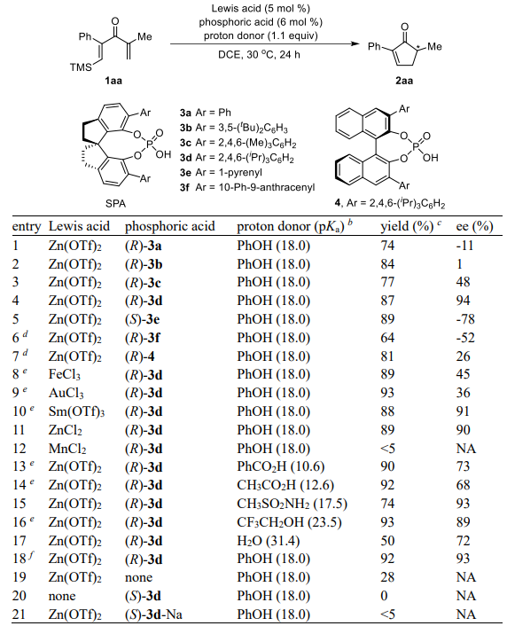 a Reaction conditions: Lewis acid/phosphoric acid/1aa/proton donor = 0.01:0.012:0.2:0.22 (mmol), in 3 mL of DCE at 30 °C, 24 h. NA = not analyzed. b pKa value in DMSO.49 c Isolated yield. d Reaction time: 20 h. e Reaction time: 12 h. f Performed at 40 °C, 12 h.