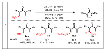 总之,朱守非课题组使用Lewis酸和手性Brønsted酸协同催化体系,首次实现了硅基导向的不对称Nazarov反应。该研究不仅为取代类型丰富的手性环戊烯酮合成提供了有效方法,其新颖的催化体系和催化机制也为不对称Nazarov反应的研究提供了新的思路,并进一步展示了该课题组提出的“手性质子梭催化剂”的广阔应用前景。