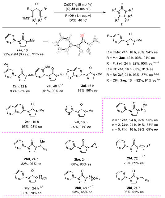 Reaction conditions: a Zn(OTf)2/(S)-3d/1aa/PhOH = 0.01:0.012:0.2:0.22 (mmol), in 3 mL of DCE at 40 °C. b PhOH (3.0 equiv). c Sm(OTf)3 instead of Zn(OTf)2 was used as Lewis acid catalyst. d Performed at 50 °C. e Performed at 15 °C. f Performed at 0 °C. g (R)-3f instead of (S)-3d was used as Brønsted acid catalyst.