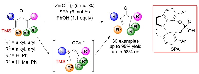朱守非课题组使用Lewis酸和手性Brønsted酸协同催化体系,首次实现了硅基导向的不对称Nazarov反应,高效合成了具有重要应用前景的多取代手性环戊烯酮,进一步拓展了“手性质子梭催化剂”的应用范围。相关成果发表于J. Am. Chem. Soc.(https://doi.org/10.1021/jacs.1c01194)。