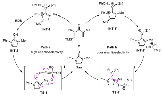 根据上述机理实验,研究者提出了可能的反应机理(图6)。底物首先被Zn(OTf)2和PhOH活化经历4π电环化生成中间体INT-1。此时TMS基团和配位的苯酚之间存在顺反两种构型(INT-1和INT-1’)。在INT-1中,配位的苯酚可能会发生分子内进攻脱除硅基生成自由烯醇INT-2,随后经历手性磷酸促进的不对称质子转移过程获得目标产物。在整个催化循环中,硅原子独特的电子效应使得碳正离子可以定位在硅基的β位,因此反应可以获得高区域选择性。烯醇中间体INT-2的不对称质子转移是反应的手性决定步。在这一步中,手性磷酸作为“手性质子梭”,通过氢键相互作用实现了反应的立体化学控制(Science 2019, 366, 990; J. Am. Chem. Soc. 2020, 142, 10557; J. Am. Chem. Soc. 2015, 137, 8700; Angew. Chem. Int. Ed. 2014, 53, 3913; Angew. Chem. Int. Ed. 2011, 50, 11483)。动力学研究表明,硅基的消除可能是反应的决速步。手性磷酸虽然没有直接参与到决速步中,但是它可能通过降低质子转移过程的反应能垒来加速整体反应的进行。当硅基和配位的苯酚处于反式时(INT-1’),反应可能经历分子间脱硅生成烯醇锌和苯酚鎓离子(INT-2’),随后发生不受手性磷酸调控的直接的碳-质子化过程生成低对映选择性产物。因为硅基的大小和构型会影响反应中两种中间体的比例(INT-1和INT-1’),进而导致反应经历不同的历程(path a和path b),所以硅基对于反应的对映选择性会产生显著影响。