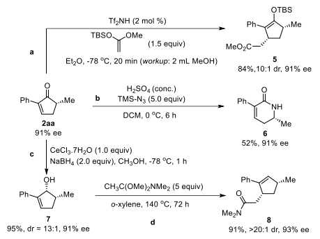 接下来研究者进行了产物转化来展示该方法学的应用潜力(图4)。环戊烯酮2aa可以作为Michael受体应用在Mukaiyama−Michael加成反应中合成具有两个手性中心的稳定烯醇硅醚化合物5。同样的,该产物可以通过Schmidt反应对映选择性保持地合成手性内酰胺6。进一步,2aa能以很高的dr值还原为对应的烯丙醇,随后经过Eschenmoser−Claisen重排反应获得具有双手性中心的化合物8。