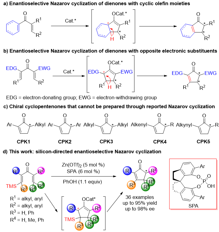 手性环戊烯酮是一类重要的合成中间体,并且作为核心骨架广泛存在于天然产物和药物分子中。Nazarov反应是构筑多取代、官能化的环戊烯酮结构的重要方法。近年来,催化不对称Nazarov环化反应也取得一系列重要进展。但是由于Nazarov环化反应经历了碳正离子中间体,若底物存在多个β氢位点,均有可能发生碳正离子的β-氢消除,则难以获得单一产物。在以往的报道中,人们在底物中引入环状烯烃结构或者芳环结构,利用环结构中碳正离子的稳定性或芳构化作用将产物的双键控制在多取代烯烃一侧(图1a);或者向底物两侧烯烃上分别引入推、拉电子基团,使碳正离子稳定在给电子基团一侧,进而确定产物的双键位置(图1b)。但是上述策略主要依赖底物设计,严重限制了所合成手性环戊烯酮产物的结构多样性(图1c)。