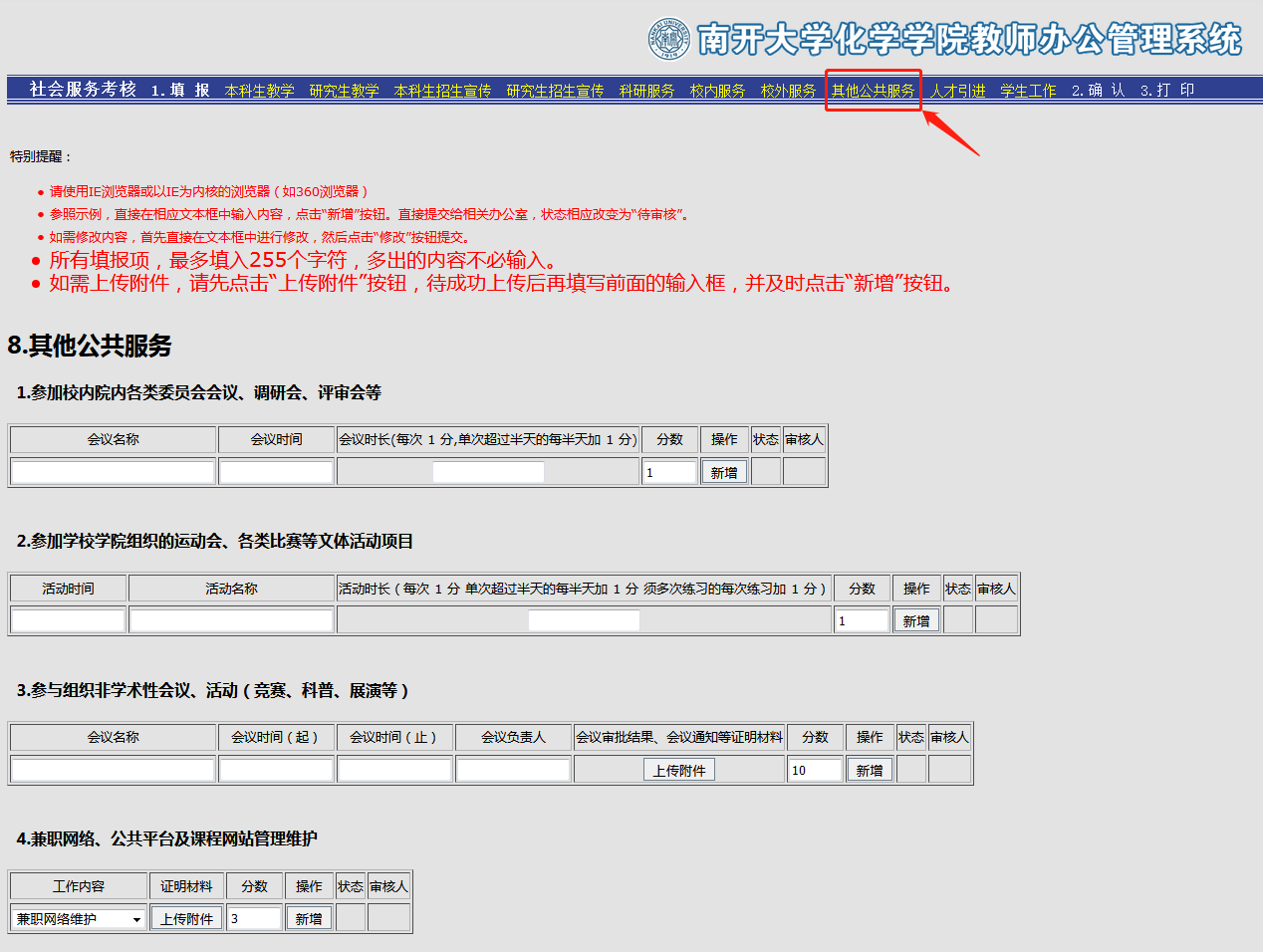 《英国365公司官网教职工社会服务考核实施细则(试行)》中涉及的各项数据均可在系统中填报并提交,公司相关职能办公室负责数据的审核和确认。其中,由公司统一组织会议、工会等各项活动,公司相关职能办公室将统一导入系统,涉及到的老师进行确认即可,不需要单独填报。