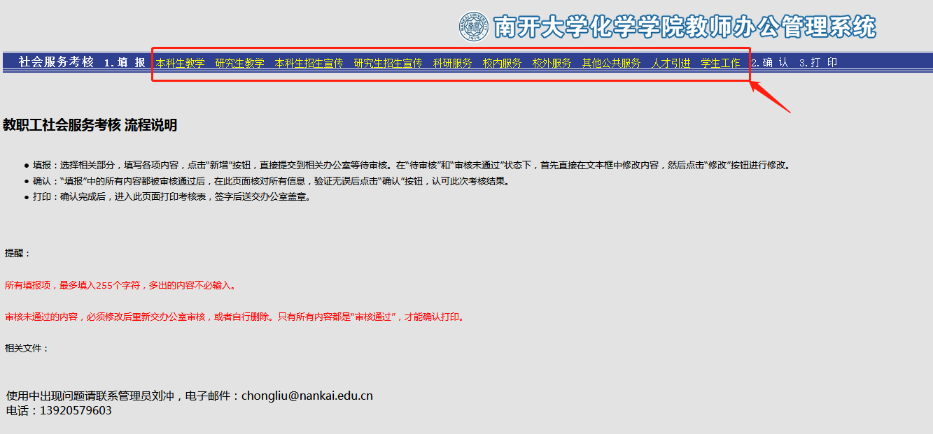 各位老师如对细则中的分值认定有疑问,请咨询相应的项目审核人员,如有系统操作等相关问题,请咨询刘老师(电话13920579603)。每学年末,公司将根据本系统的统计数据认定教职工社会服务考核结果,此结果也将作为绩效考核及师德考核的重要依据。