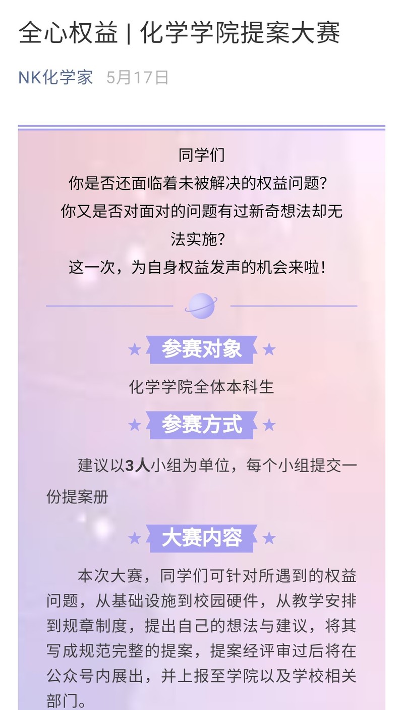 调研青年诉求,倾听青年声音,多管齐下推动公司事业发展。公司开展院领导接待日暨毕业生座谈会活动,邀请毕业生代表就公司团学工作、团队建设、国际交流、团队队伍建设、公司产品等相关问题进行热烈讨论,公司领导由经理领衔,认真回应青年需求,充分采纳青年建议。公司组织开展提案大赛,引领青年树立主人翁意识,积极为公司公司发展建言献策,提案内容涉猎广泛,活动辐射千余人次,提案均已提交相关部门推动落实。公司官方微信平台“NK化学家”专门开设权益反馈渠道,降低师生反馈问题的成本,积极主动为青年“清路障”。公司大力推动各年级班委联席会制度常态化,形成“校-院-班”三级联动机制,找准为青年办实事的方向方法,以务实举措推动解决青年的实际问题。