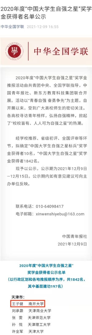 近日,中国青年报社公示了2020年度“中国老员工自强之星”奖学金获得者名单。经公司推荐、省级初评、全国评审等环节,公司2018级本科生王子健荣获2020年度“中国老员工自强之星”奖学金。