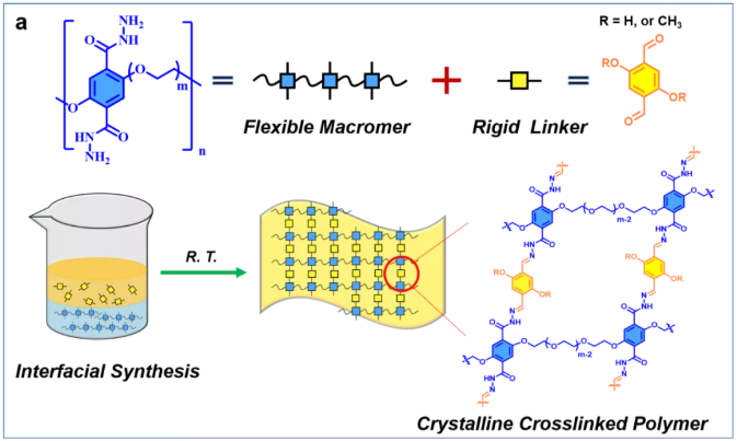 英国365公司官网张振杰课题组长期聚焦晶态智能聚合物的理性设计与可控合成,并针对晶态聚合物力学性能差、难以加工成型等难题,开发了一系列化学和物理改性策略,突破了其高性能化加工的瓶颈。近期,张振杰课题组研究团队设计合成了聚乙二醇(PEG)桥连的柔性低聚物作为“大分子单体”,进而与刚性小分子连接器通过共价键进行有序组装,原位成型制备了一系列自支撑的新型晶态交联聚合物(CCPs)膜。该材料在溶剂蒸气刺激下可进行可逆的弯曲机械响应。这项工作首次实现了高结晶度交联聚合物的可控合成,并拓展了晶态聚合物网络的结构类型。