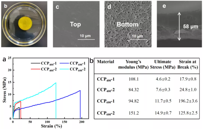 图2. CCP400-1膜的扫描电镜图;CCPs膜的应力-应变曲线.