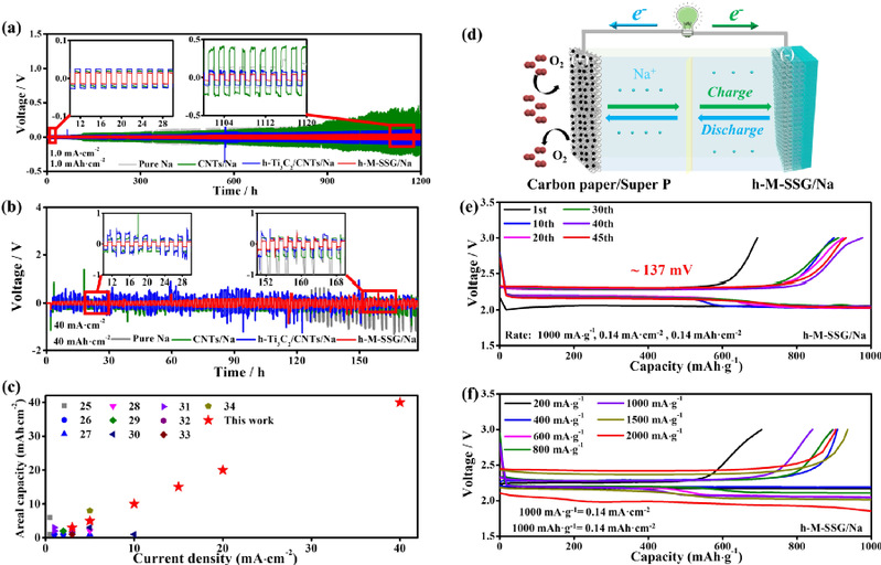 图5. h-M-SSG/Na基对称电池和钠氧电池在大电流密度下的循环稳定性表征