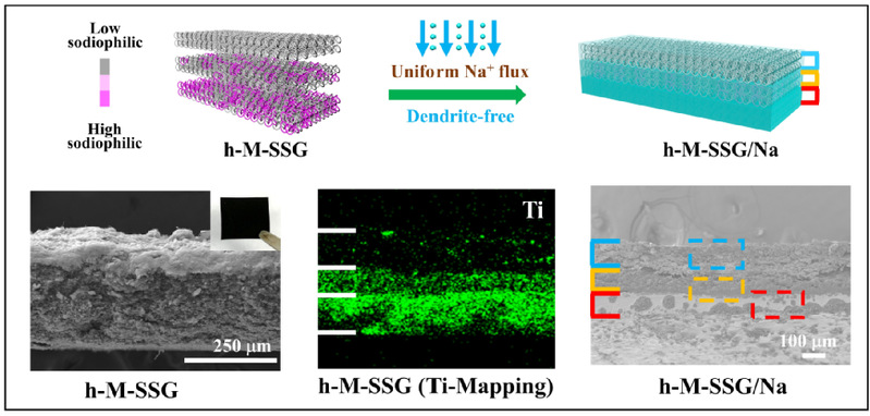 图1. 梯度结构诱导钠离子自下而上均匀沉积示意图和扫描电镜图