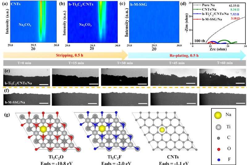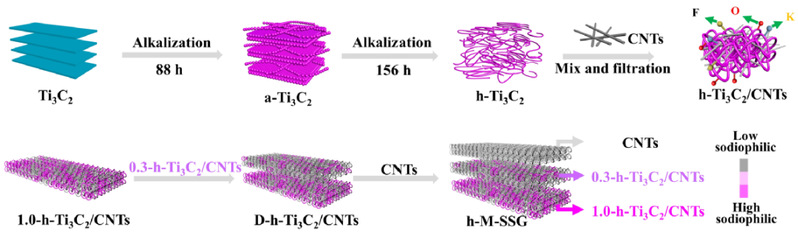 要点一:利用高浓KOH溶液,并延长碱化时间制备羟基纤维化h-Ti3C2,与CNTs进行超声振荡后即可获得h-Ti3C2/CNTs原料溶液,其中h-Ti3C2具有丰富的氧、氟等亲钠性官能团。