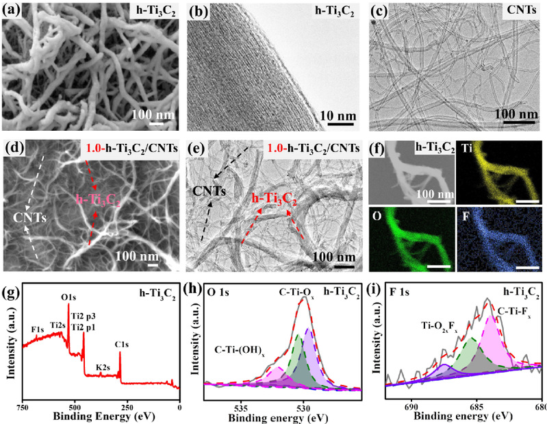 图2. 羟基纤维化h-Ti3C2及其原料溶液的形貌结构与物化性能表征