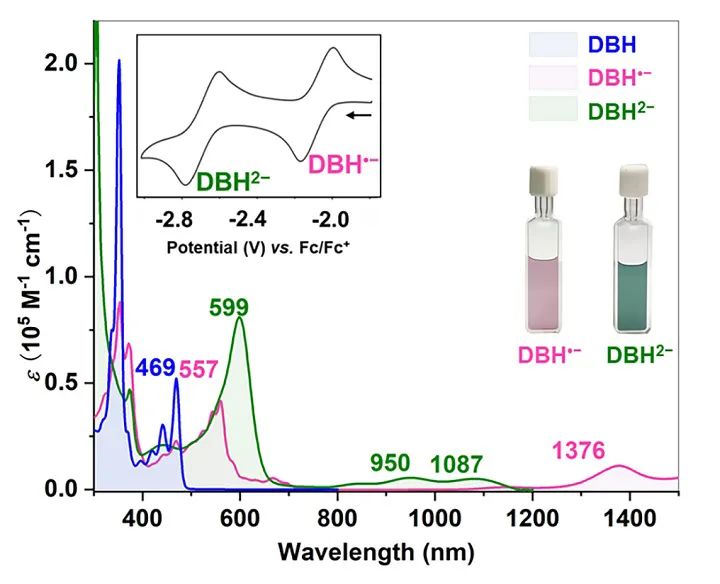 图5. DBH、DBH•−和DBH2−的吸收光谱、溶液图片以及DBH的循环伏安图