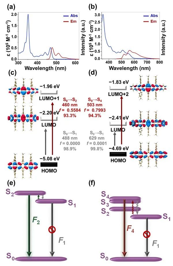 图4. DBH(左)与DBN(右)的(a-b)吸收发射光谱、(c-d)基态TD-DFT计算的主要电子跃迁和(e-f)基于热活化机理的反Kasha发射示意图