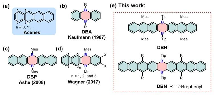 并苯(Acenes)类化合物因其独特的分子结构在有机光电材料等领域有着广泛的应用前景(图1a)。例如,蒽的衍生物是经典的蓝光材料,并五苯是性能优异的空穴传输材料等。目前人们对并苯的研究主要集中在并五苯以及更短的并苯分子,而对更长的高阶并苯(苯环数量N ≥ 6)的探索却受限于其合成上的挑战与极差的空气稳定性。得益于表面合成技术的发展,人们在超高真空(UHV)条件下不断突破极限,已经能够合成出最长的并十二苯(N = 12),并通过扫描隧道显微技术(STM)对其进行了表征。相比之下,利用经典的溶液法制备高阶并苯依旧存在很大的困难,目前通过该方法合成的并苯长度始终难以突破9个苯环单元(N ≤ 9)。在并苯骨架中引入sp2杂化的主族元素不仅能够改善其稳定性,而且可以有效地调控其电子结构与光电性质,因而备受人们关注。例如,氮杂、氧杂、硫杂高阶并苯近年来不断被报道,显示出独特的光电和磁学性质。硼原子因具有独特的空轨道而被广泛引入稠环芳烃(PAHs)结构中,创造了许多性质优异的新型共轭分子,但目前关于硼杂并苯化合物(boraacenes)的研究却非常有限(图1b-d),具有良好空气稳定性的硼杂高阶并苯更是从未被报道过。
