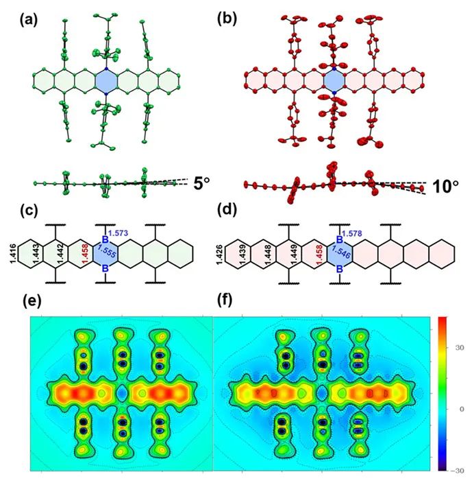 DBH和DBN的结构均通过单晶X射线衍射得以确认(图3a-b)。可以看出两个分子都有很好的刚性结构,zigzag位取代基近乎垂直于骨架平面,并且稠环数量的增多会使骨架发生轻微的扭曲。经过测量不同位置的键长,作者发现骨架中心具有4π电子的C4B2环的C-B键键长(1.55 Å)要短于一般未成环的C-B键键长(如三芳基硼中C-B键的键长:1.57 ~ 1.59 Å),同时C-C键键长(1.46 Å)要长于骨架中其它C6环相同位置的C-C键键长(1.41 ~ 1.42 Å)。这表明π电子能够离域在整个C4B2环上,使其呈现出反芳香性的特征(图3c-d)。理论计算的NICS(1)zz值、ICSS(1)zz图以及ACID图也同样证明其反芳香性的特征(图3e-f)。