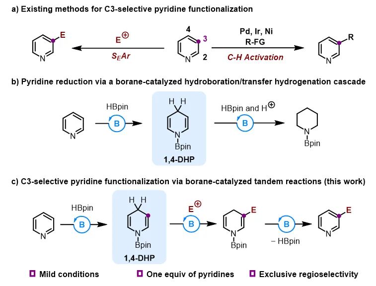 由于氮原子的拉电子作用,增强了C2和C4位的亲电性,使其容易发生亲核取代反应,以Chichibabin反应(负离子亲核试剂)和Minisci反应(自由基亲核试剂)为代表的亲核取代反应是吡啶C2和C4位官能化的主要方式。吡啶C3位可以发生亲电取代反应(SEAr),然而,只有卤化和硝化等少数反应可行,且反应条件非常剧烈(强酸性、>300 ℃)。近期,过渡金属催化的碳氢键活化反应实现了吡啶C3位的多种官能化,但是这些反应大多使用大过量吡啶,且难以避免其他位置反应的副产物,降低了实用性(图1a)。因此,迫切需要开发一种通用且高效的策略实现吡啶C3位官能化。