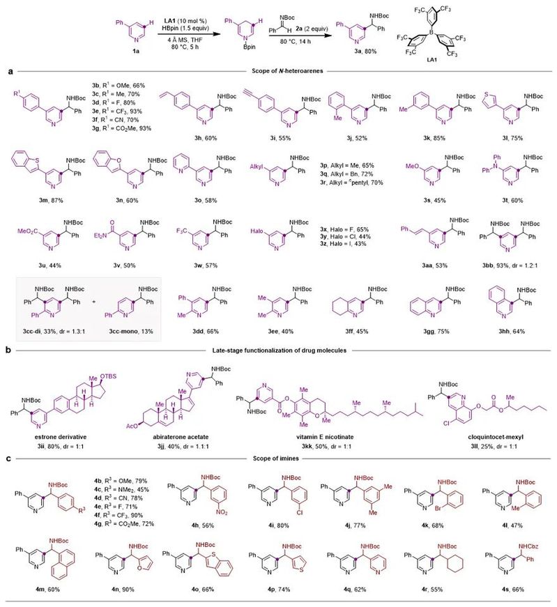 英国上市公司365王晓晨课题组长期致力于有机硼催化研究,发展了以五元并环和五元螺环为骨架的两类手性有机硼催化剂,并且实现了吡啶的串联还原、不对称串联还原等工作(Angew. Chem. Int. Ed., 2017, 56, 5817; Angew. Chem. Int. Ed., 2020, 59, 18452; ACS Catal., 2021, 11, 10824)(图1b)。基于上述工作,该课题组利用有机硼催化的吡啶硼氢化反应中产生的1,4-二氢吡啶中间体,通过引入亲电试剂,实现了吡啶C3位烷基化反应(图1c)。由于1,4-二氢吡啶的β位具有较强的亲核性,保证了取代反应的高活性和专一的位置选择性。反应对于各种取代的吡啶和亚胺均适用,还可以应用于多个药物分子的后修饰(图2)。而且,醛、酮、Eschenmoser盐等亲电试剂也适用。
