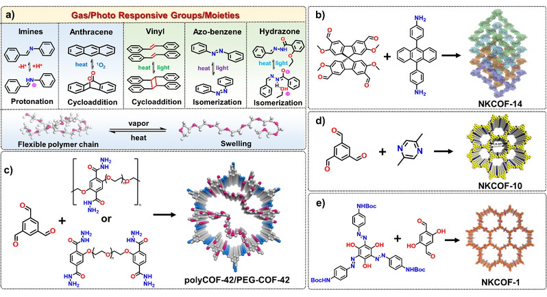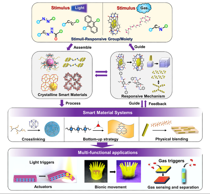 该课题组主要聚焦在光响应和气响应晶态智能材料的设计与构建。光和气响应具有无线操控、成本低、环境友好、多模式控制等优势,是目前刺激响应类型的研究焦点。作者基于材料结构的理性设计,将亚胺、蒽、聚合物链等气响应基团以及偶氮、乙烯基、蒽和腙等光响应基团引入到晶态材料的骨架中,构建了一系列多维度的、结构多变的晶态智能材料(图二)。根据所构建材料的维度不同,晶态智能材料包括:(1)零维的分子晶体(如小分子、分子笼、簇基化学物);(2)一维分子链(如链状配合物、线性高分子);(3)二维和三维的框架材料(如金属-有机骨架,MOFs;共价有机骨架,COFs;氢键有机框架,HOFs)。