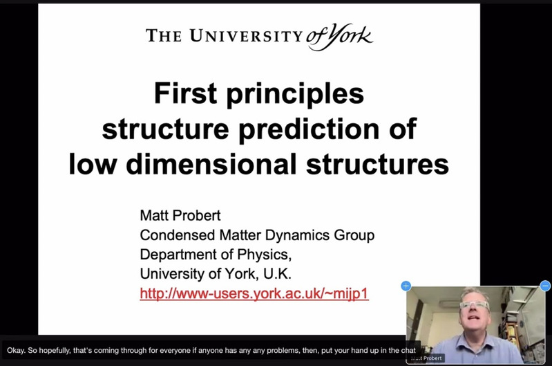 Chris Skylaris(南安普顿大学)、Jonathan Yates(牛津大学)、Joseph Barker(利兹大学)、Martina Stella(的里雅斯特大学)、Michael Herbst(亚琛工业大学)、Nick Hine(华威大学)、Matt Probert(约克大学)、Matt Hodgson(约克大学)八位专家学者围绕电化学模拟、质谱分析预测、原子自旋动力学、密度泛函理论算法等主题做了专题报告。