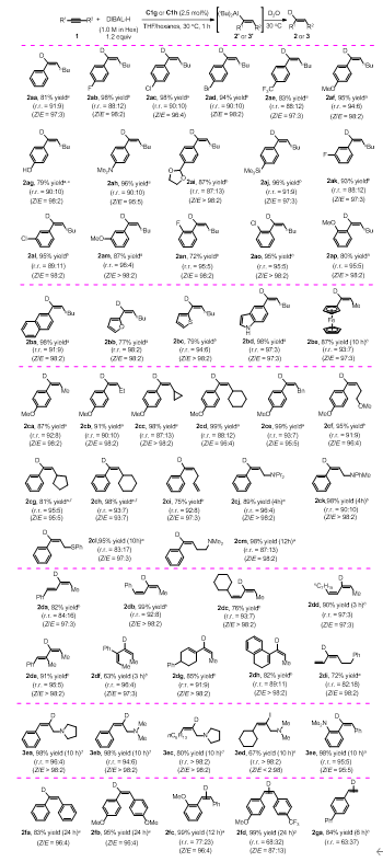 有机铝基于地壳中含量最高的金属元素,稳定性较高,可以发生多种转化,是一类重要的金属有机试剂,广泛应用于合成中。炔烃的氢铝化反应可以从简单易得的铝试剂合成更有用的烯基铝,具有重要的应用价值。虽然一些活泼的炔烃和活泼的铝试剂在加热下能直接发生氢铝化反应,但是反应通常存在较多副产物,且产物的选择性由底物控制,无法自由调控。过渡金属催化的炔烃氢铝化则可以方便地通过改变配体调控反应的选择性,因此在合成上有明显优势。虽然过渡金属催化的端炔氢铝化已经得到很好的结果,过渡金属催化的高选择性内炔氢铝化反应成功的例子很少,而且存在催化剂类型少、底物单一、选择性不理想等问题。因此,发展新催化剂,实现商业可得的铝试剂与多种内炔的高选择性氢铝化,并将该反应应用于功能分子的合成,具有重要研究价值。
