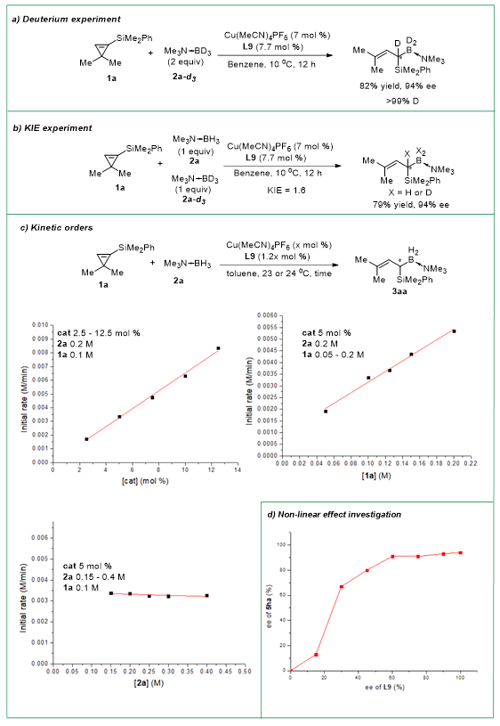研究人员对反应机理进行了初步探究(图4)。动力学级数表明反应对催化剂、环丙烯为一级、硼烷为零级,环丙烯开环为决速步。反应展现出明显的正非线性效应,说明反应的活性铜催化剂可能具有双核乃至多核结构。