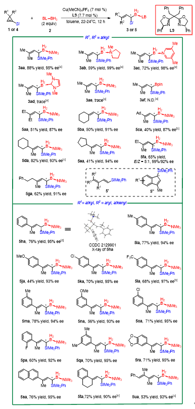 以铜/手性双噁唑啉络合物为催化剂,在温和条件下,多种3,3-双取代的环丙烯底物均能够以中等或以上的收率(40-88%)以及优异的对映选择性(87-99%)得到E式构型的手性偕硅硼产物(图2)。其中,3,3-双烷基取代底物的副产物主要是共轭二烯基硅5’,而3-芳基-3-烷基取代底物的副产物则为1-硅基茚5’’。