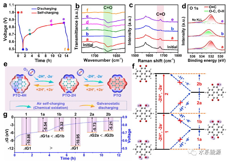 a) Pb/PTO电池电压-时间曲线。放电过程的电流密度为0.2 A g-1。PTO电极在电压-时间曲线标记点的各种非原位测试:b) FTIR光谱,c)拉曼光谱,d) O 1s的XPS光谱。e)计算PTO-4H分子在空气自充电过程中范德瓦尔斯表面的MESP分布及相应的充电产物。f)各种H+提取途径,g)对应ΔG。