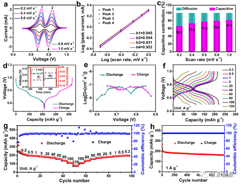 a)不同扫描速率下的CV曲线。b)根据CV曲线绘制每个峰值的log(峰值电流)与log(扫描速率)的对应图。c)不同扫描速率下的电容贡献。d) GITT曲线。插图为出料过程中GITT曲线的选取步骤。e)充放电过程中的H+扩散系数。f)不同电流密度下的恒流放电/充电曲线。g)速率性能。h)电流密度为1 A g-1时的循环性能。