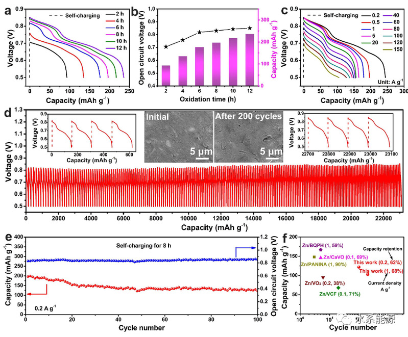 a)不同空气自充电次数在0.2 A g-1时的恒流放电曲线。b)自充电时间对OCV和放电容量的影响。c)自充电12 h后不同电流密度下的恒流放电曲线。d)自充电6 h后以1 A g-1的频率重复空气自充电/恒流放电循环。插图显示了第一个(左)和最后一个(右)4个循环以及PTO电极在不同状态下的SEM图像(中)。e)自充电8小时后,在0.2 A g-1下的循环性能。f)比较Pb/PTO电池与先前报道的基于近中性电解质的空气可充电AMBs的自充电循环性能。