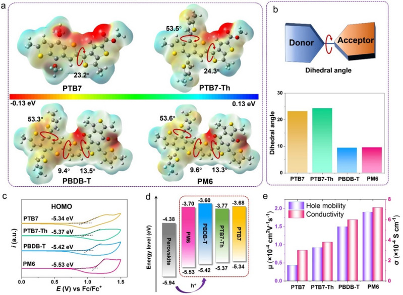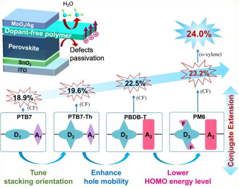 钙钛矿太阳能电池(PSC)因其在效率方面的巨大提升和低成本的溶液处理工艺而成为光伏行业一项有前途的技术。目前最先进的PSC中使用的主要HTM仍然是Spiro-OMeTAD,其通常需要通过吸湿性的LiTFSI和叔丁基吡啶(TBP)进行化学掺杂,以提高其迁移率和导电性。因此,基于掺杂HTM的高效PSC在器件成本和稳定性方面面临巨大挑战,为了获得高性能和稳定的PSC,开发非掺杂HTM以取代占主导地位的Spiro-OMeTAD已成为一个紧迫但具有实验挑战性的问题。然而,非掺杂器件的效率仍然低于基于掺杂Spiro-OMeTAD的最佳性能(PCE>25%)。而且目前仍然缺乏一种明确有效的分子设计策略来指导高性能非掺杂HTM的开发。因此,研究聚合物的结构-性能关系对于提供新的材料设计规则和开发用于高性能PSC的高效非掺杂HTM至关重要。