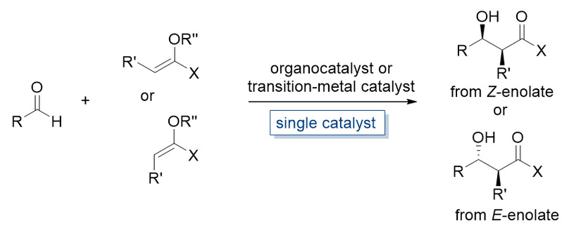 教科书中的经典反应羟醛缩合(Aldol)是一类构建碳-碳键的最重要的有机合成转化之一。作为制备手性β羟基羰基类化合物的首选方法,不对称Aldol反应长期以来得到了很好的发展;基于有机小分子催化或者过渡金属催化的不对称Aldol反应层出不穷。另一方面通过对反应条件及底物的合理选择,无论是syn型还是anti型aldol产物都能够选择性的制备。比如基于Zimmerman–Traxler模型时,syn型产物可以从Z-型的烯醇负离子获得;而anti型产物则可以从E-型的烯醇负离子获得(图1)。虽然单一催化模式的不对称aldol反应取得了巨大的成功,发展从同一类底物出发的立体发散性aldol反应却长期未能解决。