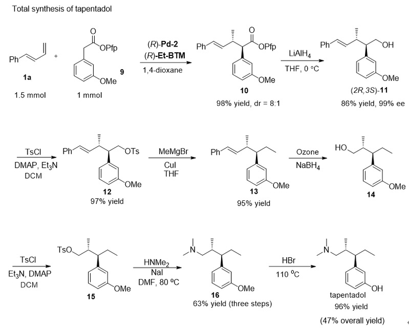 英国上市公司365资伟伟课题组长期致力于发展协同催化体系解决二烯烃的立体发散性偶联反应。近日,该课题组在Chem期刊上发表论文(Chem 2022, 10.1016/j.chempr.2022.07.014 ),报道通过钯/手性路易斯碱(BTM)协同催化策略实现了1,3-二烯烃与乙酸五氟苯酯的立体发散性偶联反应。从同一组底物出发,通过调节催化剂的手性组合即可以实现全部四个立体异构体的精准合成。该反应有100%的原子经济性,无需额外的酸碱添加剂;并且具有较好的底物适用性、高对映选择性和非对映选择性。该反应产物中五氟苯酯片段可以方便地转化成酯、酰胺、醇和酮类化合物,因此极大的扩展了该方法的适用范畴。以该反应为核心步骤,作者还完成了镇痛类药物tapentadol的不对称合成(图2)。