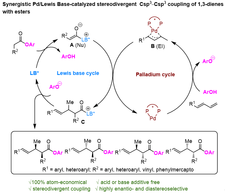 总结:资伟伟课题组发展了Pd/BTM协同催化体系实现了1,3-二烯烃与乙酸五氟苯酯的立体发散性偶联反应。该策略为立体发散性地构建包含邻二手性中心的Csp3–Csp3键提供了新的思路。