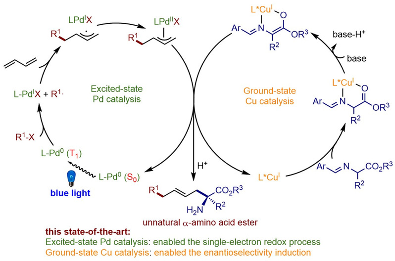 总结:资伟伟课题组首次利用钯/铜协同催化的策略成功实现了激发态钯参与的对映选择性三组份偶联反应,在温和条件下合成了一系列不饱和非天然α-季碳氨基酸衍生物。这一方法将为不对称激发态过渡金属催化提供新的思路。