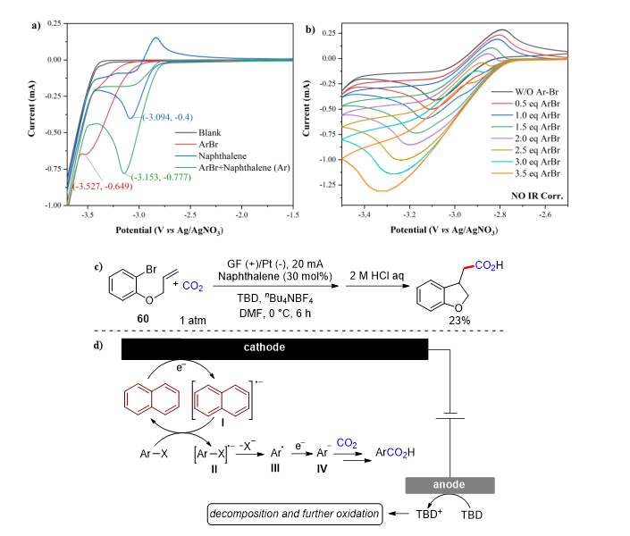 理论计算结果表明:萘自由基负离子作为反应过程中的中间体,经单电子转移还原卤化物在能量上是非常有利的,紧接着生成的卤化物自由基负离子快速发生解离,生成相应的芳基或者烷基自由基。接着,作者通过循环伏安法(CV)实验进行了反应机制的研究。首先,在氩气氛围下,观察到了底物3在-3.53 V vs Ag/AgNO3的还原峰(图4a,红线);在-3.09 V vs Ag/AgNO3观察到了萘的可逆还原峰(图4a,蓝线)。当向萘中加入底物后,萘的还原峰明显增大,证明了该过程中有催化电流。该结果表明萘可以作为媒介促进卤苯的还原。接着,作者还尝试逐渐增大体系中底物的浓度,可以明显地观察到萘的氧化峰逐渐消失,还原峰逐渐增大,且当底物的浓度增大到萘的3.5倍时,萘的氧化峰完全消失(即体系中萘的量约为30%)(图4b)。这一结果与实验一致,即萘的量为30 mol%为最优条件。此外,以60作为底物时,将温度降到0 ℃,标准条件下生成了相应的分子内环化羧化的产物,证明了反应过程中芳基自由基的存在(图4c)。