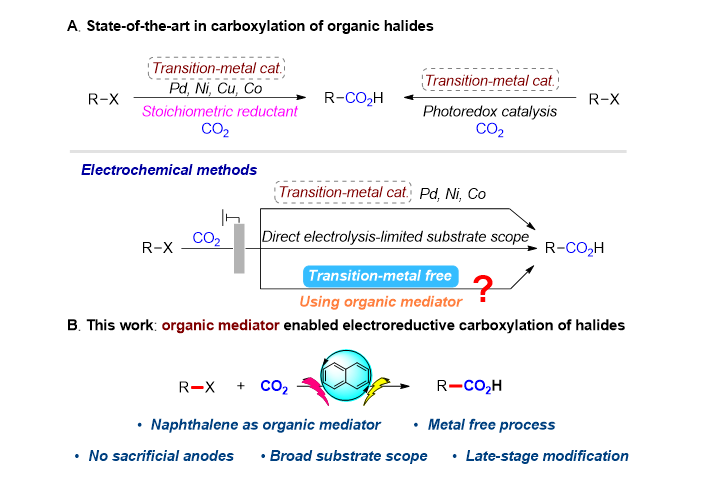 CO2作为储量丰富、廉价易得且可再生的C1资源,其催化转化生成高附加值的化学品一直是合成化学领域的研究热点。从绿色有机合成化学研究的角度来看,CO2在催化剂的作用下与简单有机化合物反应生成含有羧基单元的反应具有原子经济性高和经济实用的优势。近年来,过渡金属催化的碳−卤键与CO2偶联羧化反应受到了广泛地关注,该类反应通常需要加入当量的金属还原剂或者结合光催化来实现(图1A,上)。然而,在实际生产中,特别是药物合成化学中,对金属残留量的要求非常苛刻,痕量的金属在后处理过程中往往需要很高的成本。因此,发展绿色、高效的非金属催化的碳−卤键羧化方法是非常有必要的。