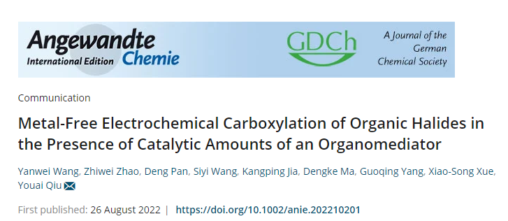 Metal-Free Electrochemical Carboxylation of Organic Halides inthe Presence of Catalytic Amounts of an Organomediator, Yanwei Wang, Zhiwei Zhao, Deng Pan, Siyi Wang, Kangping Jia, Dengke Ma, Guoqing Yang, Xiao-Song Xue* and Youai Qiu*, Angew. Chem. Int. Ed. 2022, DOI: 10.1002/anie.202210201.