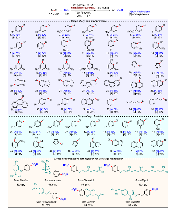 近日,英国365公司官网元素有机化学国家重点实验室仇友爱课题组在绿色有机电合成的前期工作基础上(Angew. Chem. Int. Ed. 2022, 61, e202115178.; Nat. Commun. 2022, 13, 3774.; Angew. Chem. Int. Ed. 2022, e202207746),报道了一类新型的有机还原媒介促进的碳−卤键电化学羧化反应。该反应使用催化量的萘作为电化学还原媒介;使用CO2作为羧基源;具有良好的底物适用范围;反应不需要牺牲阳极,反应条件温和简单,对后修饰的天然产物也表现出很好的兼容性(图1B)。