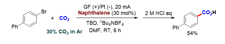 该方法的底物普适性好,适用于不同基团取代的芳基溴化物和芳基氯化物,以中等到优秀的收率生成相应的苯甲酸类化合物。对于具有较高还原电势的富电子芳基卤化物,反应也能够顺利进行。值得一提的是,该方法还可以适用于简单的烷基溴化物,以中等收率生成相应的简单烷基羧酸类化合物。控制实验表明,萘在该反应过程中起到了非常关键的作用;不添加萘媒介的时候,该反应主要生成脱卤氢化的产物。针对复杂的芳基溴化物,如药物活性分子薄荷醇、异冰片以及布洛芬衍生物,天然产物如香茅醇、植物醇、紫苏醇以及香芹醇的衍生物也都能够顺利进行该反应(图2)。值得注意的是,该反应在较低CO2浓度氛围下也可以进行(30% CO2 in Ar),对CO2在有机合成化学中的应用具有重要的参考意义(图3)。