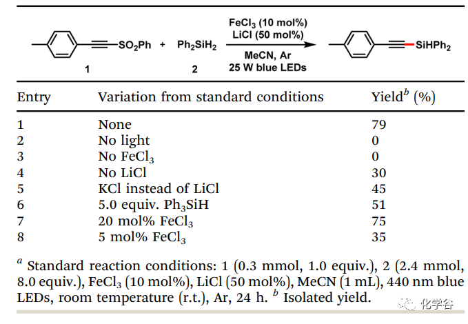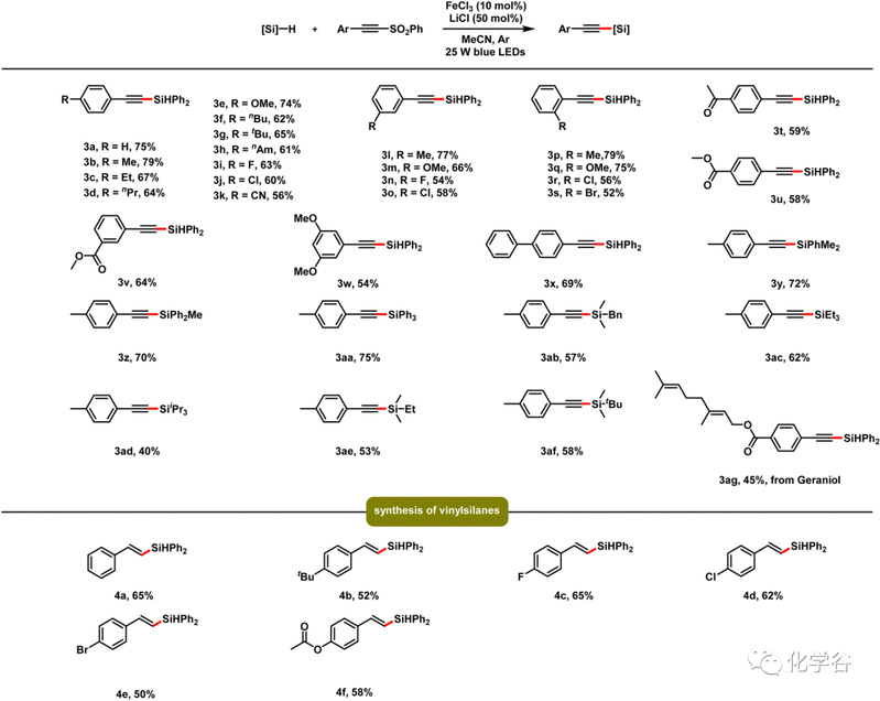作者通过使用 (4-甲基苯基)-乙炔基苯基砜 (1)和二苯基硅烷(2)开始优化。在图下最优条件中,反应体系可以获得了 79% 的分离产率。对照实验表明,光和铁催化剂对于该反应都是必不可少的,而添加 LiCl 将有助于提高产率,降低硅烷当量会导致总反应产率显着下降。
