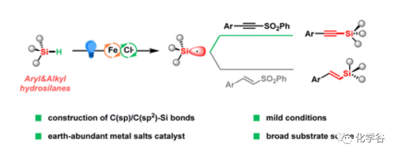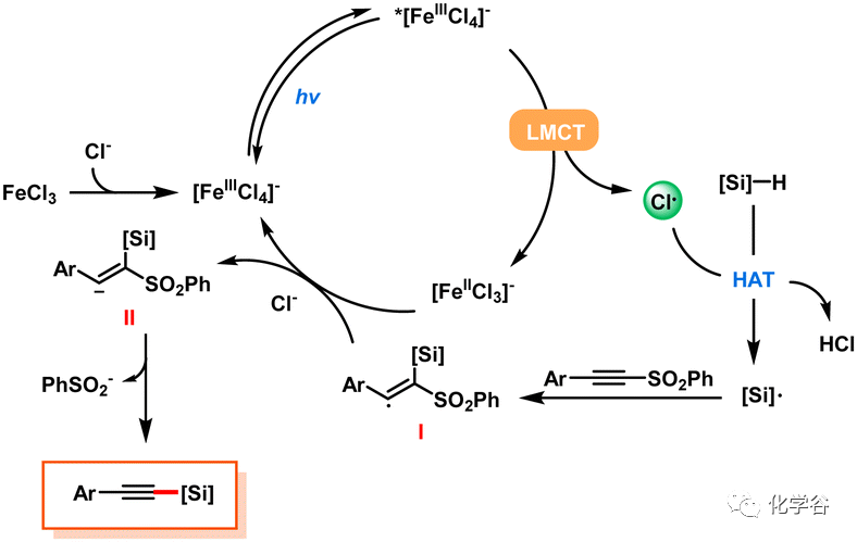 在机理上,作者提出了如下推测:可溶性 FeCl3和 LiCl 形成 [FeIIICl4]-,当 [FeIIICl4]-被蓝光激发通过 LMCT 过程形成氯自由基时,反应开始,该自由基可用作 HAT 试剂得到反应性甲硅烷基自由基,该自由基立即与炔基砜加成得到中间体I;后者通过单电子还原形成II并完成催化循环,随后砜基团的脱除得到产物。