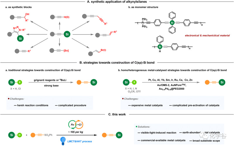 炔基硅烷是一种特殊的化合物,其可参与多种有机反应。该硅烷类基团既可以被视为保护基团,也可以用于碳/碳和碳/杂原子键的形成。随着相关研究的不断深入,具有高热稳定性的炔基硅烷结构也常应用于材料领域,其可以作为合成高分子材料的重要单体。因此,炔基硅烷化合物的巨大应用潜力引发了人们对其合成和进一步转化方法的极大兴趣。