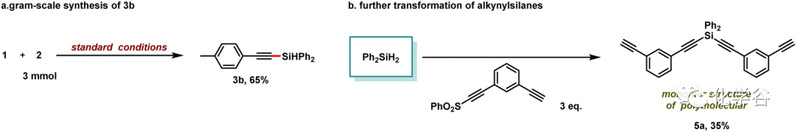 为了证明该方法的实用性,作者使用上述条件在 3 mmol 规模上进行了克级反应,得到 65% 的3b产率。同时作者对称芳族二炔可以进行双官能化得到产物单体结构5a,这可能能够在进一步转化中构建一些线性或环多分子材料。