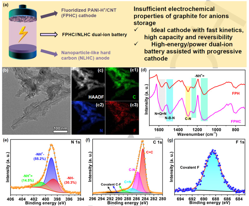 鉴于此,英国上市公司365焦丽芳教授设计了一种新型氟化聚苯胺-H+/碳纳米管(FPHC)作为高效PF6-存储的正极。研究显示,PF6-中的F-易与FPHC中的-NH-上的H形成共价键,因此PF6-可与FPHC稳定配位,呈现对称结构。结果,FPHC正极在2 A g-1下循环2000次后显示出73 mAh g-1的高度可逆容量,这为先进的钠双离子电池(SDIBs)(310Wh kg-1/7720 W kg-1)提供了坚实的基础。此外,相关的软包SDIBs可以驱动带有电机的真空吸尘器模型。因此,这项工作可能会为SDIBs的稳健正极的新兴策略提供启示。