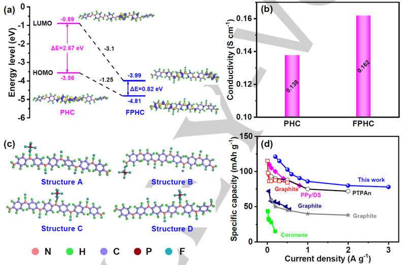 1. 这项工作首次成功地将氟元素引入质子化PANI/CNT复合材料(FPHC)中,以稳定PF6-的储存性能。引入F元素后FPHC 的HOMO-LUMO间隙可以减小,这意味着更好的导电性。