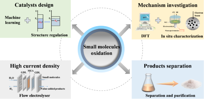 催化剂的设计:目前关于小分子氧化反应催化剂的设计策略多来自于传统的电解水催化剂的方法,尚缺乏有针对性的关于小分子氧化反应催化剂的设计。因此,有必要深入了解相关的催化反应机理,实现对每一个小分子氧化反应的针对性设计,使催化剂的潜力得到开发。机器学习可以作为快速筛选小分子氧化催化剂的有效工具。此外,小分子通常含有多种官能团,对不同官能团与催化剂之间的关系进行深入的理解,也有助于设计高效的催化剂。