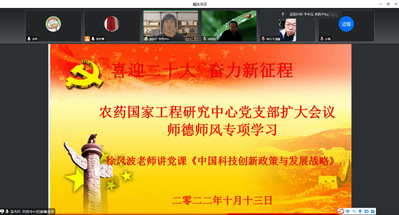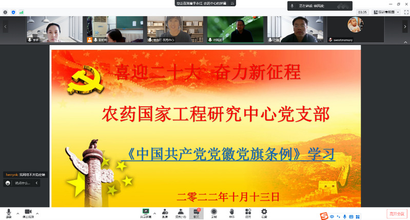 2022年10月13日下午,农药国家工程研究中心党支部采用线上腾讯会议的形式,开展“喜迎二十大 奋力新征程”主题系列学习会。